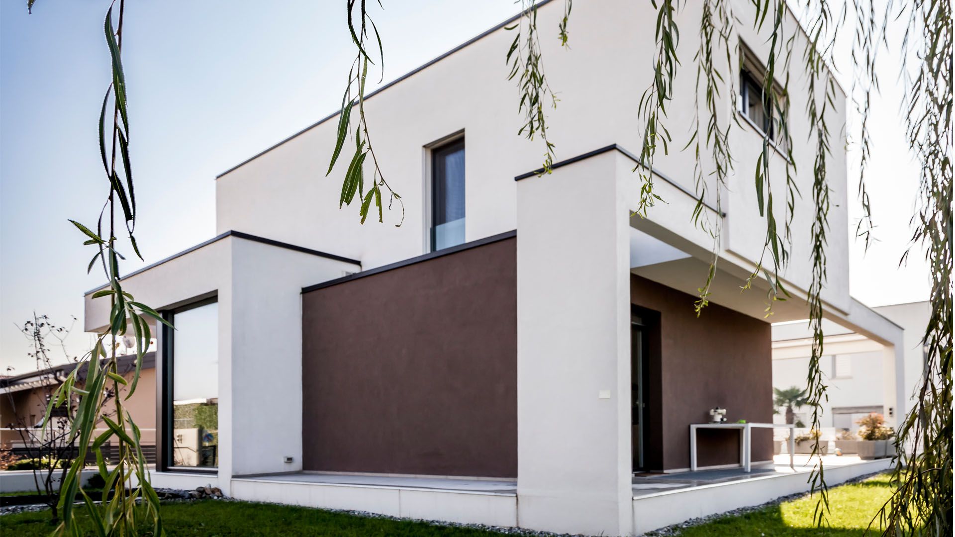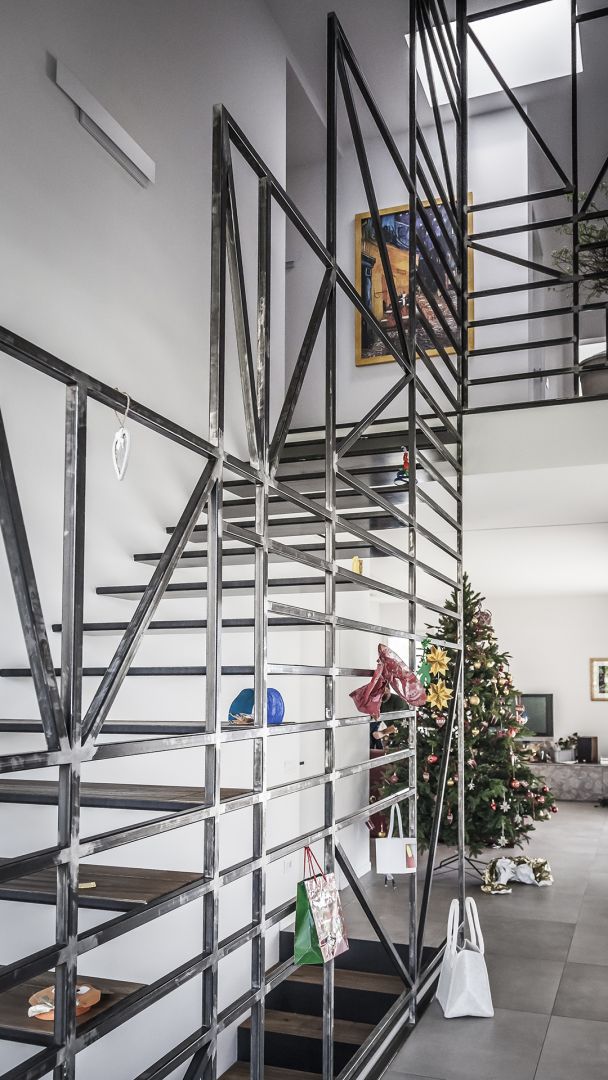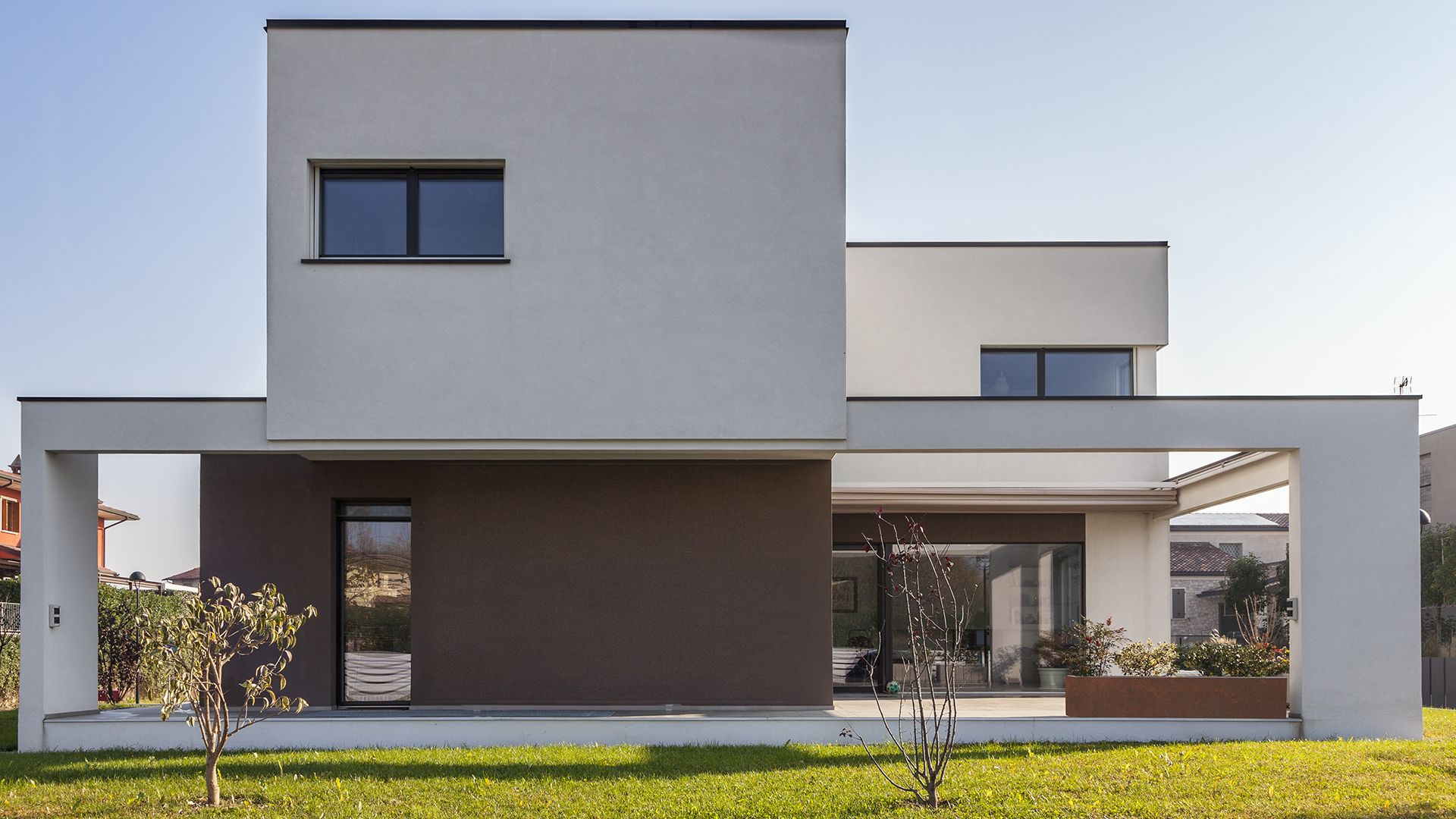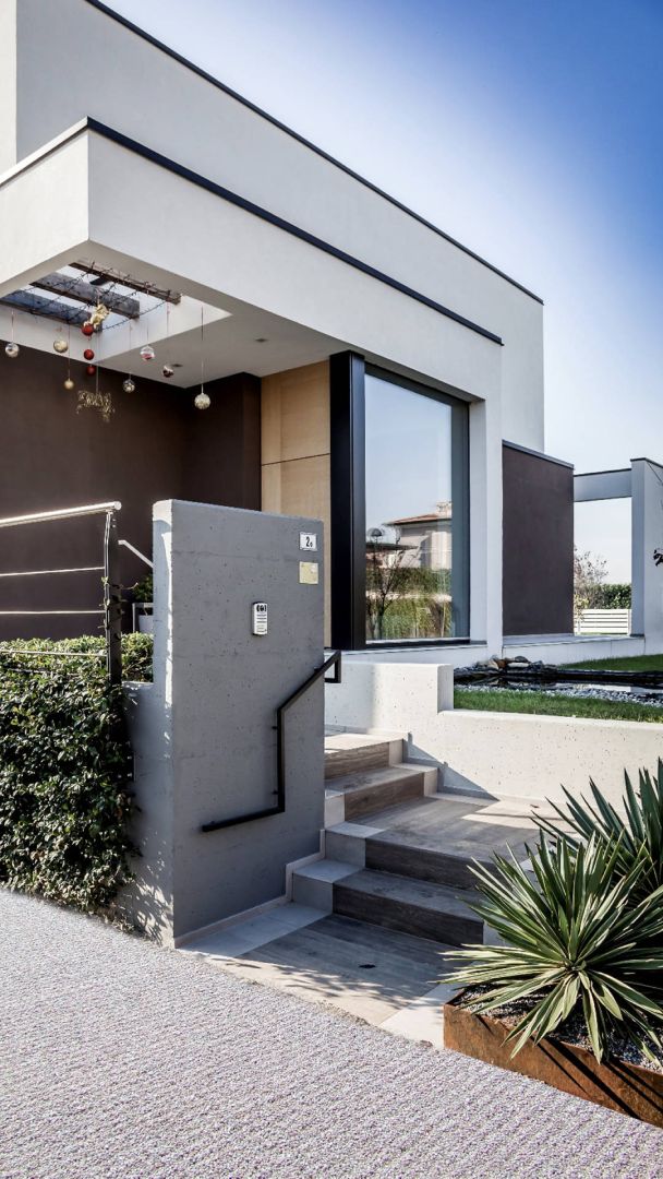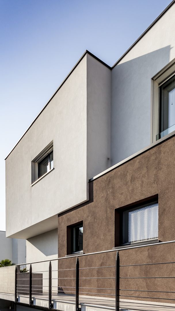 Il fabbricato unifamiliare pensato per una coppia di amici è costituito da un volume unico, su due livelli fuori terra, svuotato al suo interno per consentire la realizzazione di uno spazio esterno intimo e protetto dagli sguardi del vicinato.